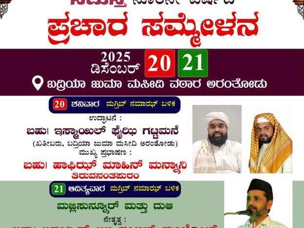 ಡಿ.20 ,21 : ಎಸ್.ಕೆ.ಎಸ್.ಎಸ್.ಎಫ್ ಅರಂತೋಡು ಶಾಖೆ ವತಿಯಿಂದ ವಾರ್ಷಿಕ ಮಜಿಲಿಸ್ ನ್ನೂರ್ ಹಾಗೂ ಸಮಸ್ತ 100ನೇ ಪ್ರಚಾರ ಸಮ್ಮೇಳನ ಕಾರ್ಯಕ್ರಮ…