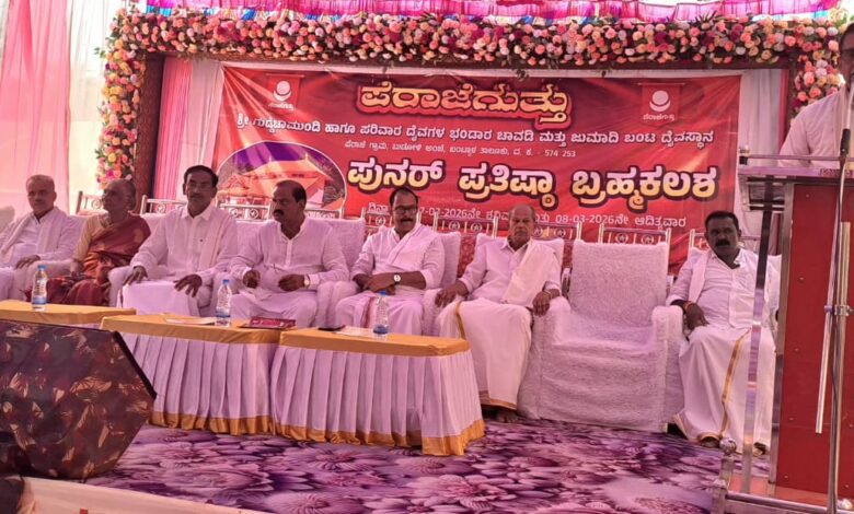 ಬಂಟ್ವಾಳ ಮಾ.10: ಪೆರಾಜೆಗುತ್ತು ಶ್ರೀ ಗುಡ್ಡೆಚಾಮುಂಡಿ ಹಾಗೂ ಪರಿವಾರ ದೈವಗಳ ಭಂಡಾರ ಚಾವಡಿ ಮತ್ತು ಜುಮಾದಿ ಬಂಟ ದೈವಸ್ಥಾನದ ಪುನರ್ ಪ್ರತಿಷ್ಠಾ ಬ್ರಹ್ಮಕಲಶವು ಬ್ರಹ್ಮಶ್ರೀ ವೇ.ಮೂ. ನೀಲೇಶ್ವರ ಉಚ್ಚಿಲತ್ತಾಯ ಪದ್ಮನಾಭ ತಂತ್ರಿಗಳ ನೇತೃತ್ವದಲ್ಲಿ ನಡೆಯಿತು.